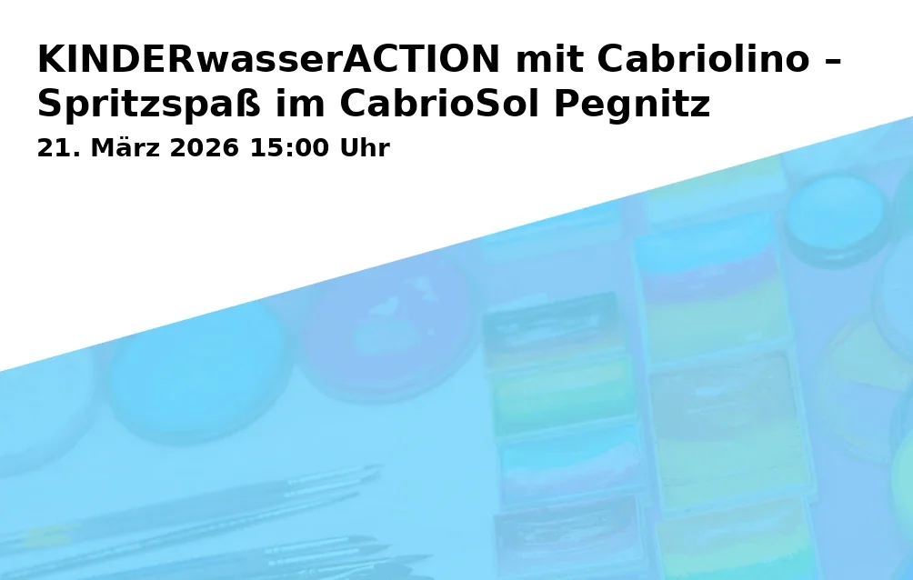 On Saturday, March 21, 2026, the KINDERwaterACTION at CabrioSol Pegnitz offers families quality time, children's laughter, and learning fun. With mascot Cabriolino, the fun starts in the swimming hall at 3:00 PM – age-appropriate, child-friendly, and safely supervised by qualified lifeguards. Families can experience a protected family event with plenty of movement, water confidence, and joy.
