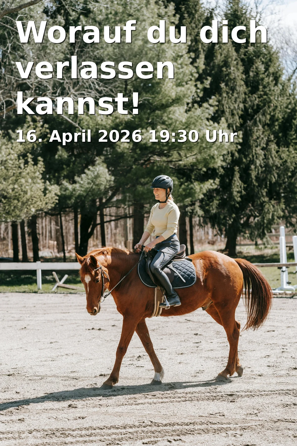 Wer Verlässlichkeit greifbar erleben möchte, ist hier richtig. Der Infoabend liefert klare Impulse und bereitet optimal auf die optionalen Praxis-Einheiten mit Pferd vor. Jetzt Platz sichern, inspiriert nach Hause gehen – und das Gelernte im eigenen Alltag anwenden.